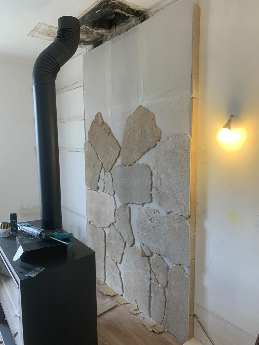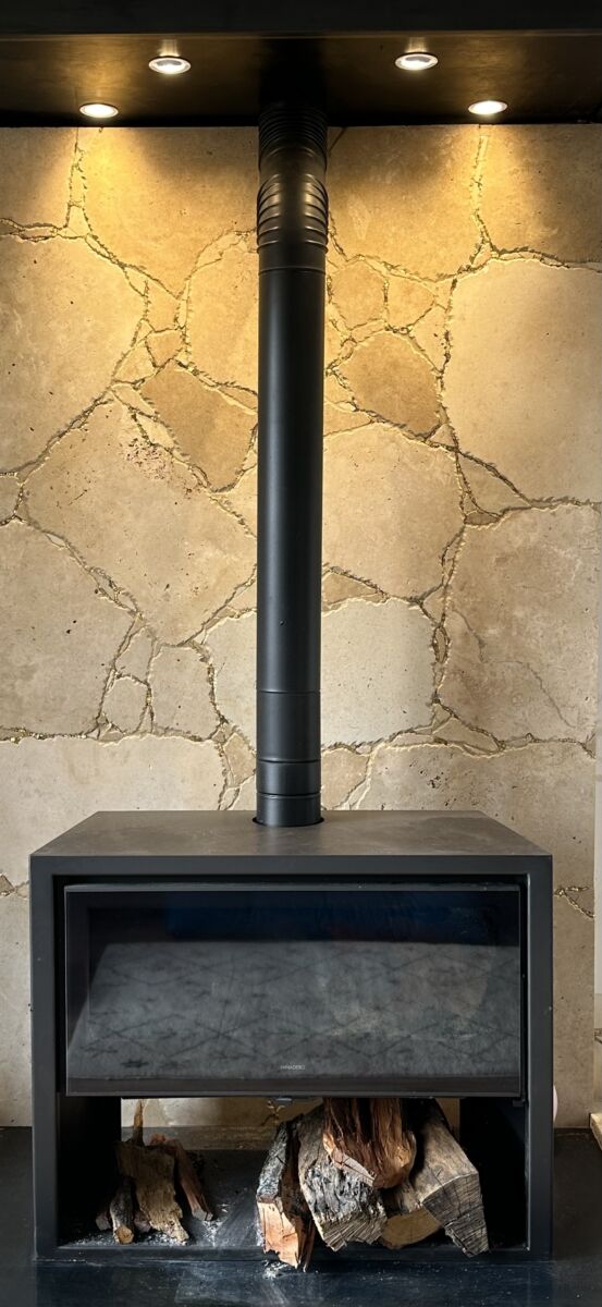 Pour habiller le mur de ce poêle, nous avons imaginé une mosaïque inspirée de la technique japonaise du kintsugi, l’art de sublimer les fissures plutot que de les cacher.