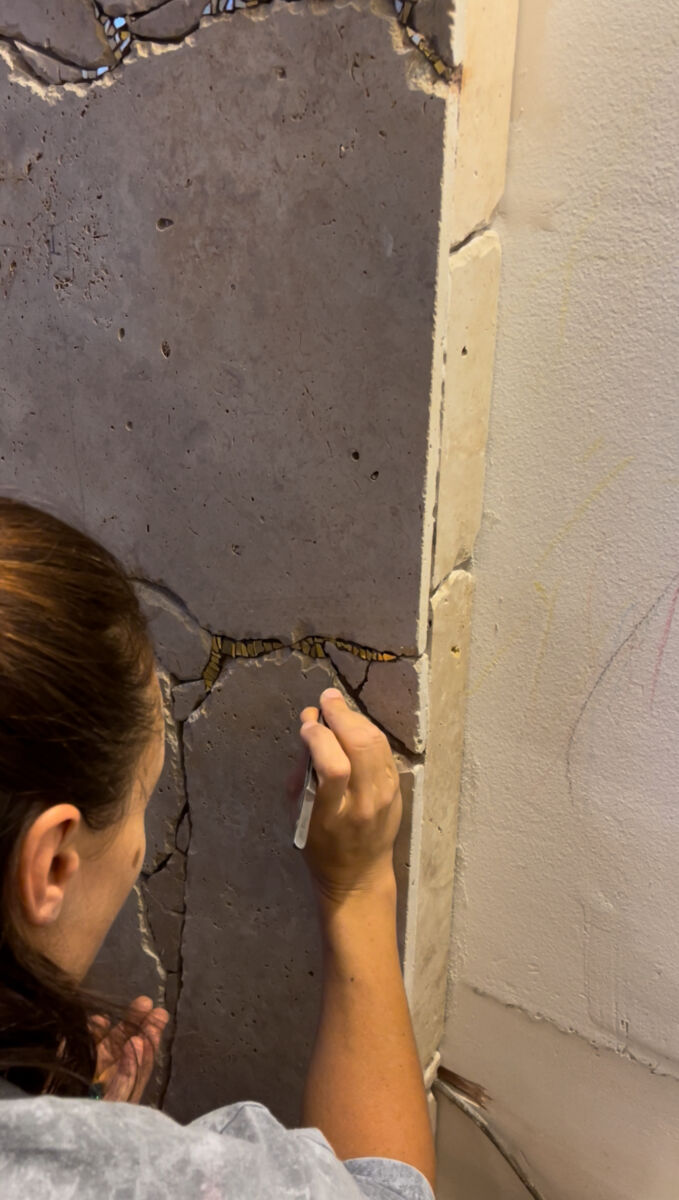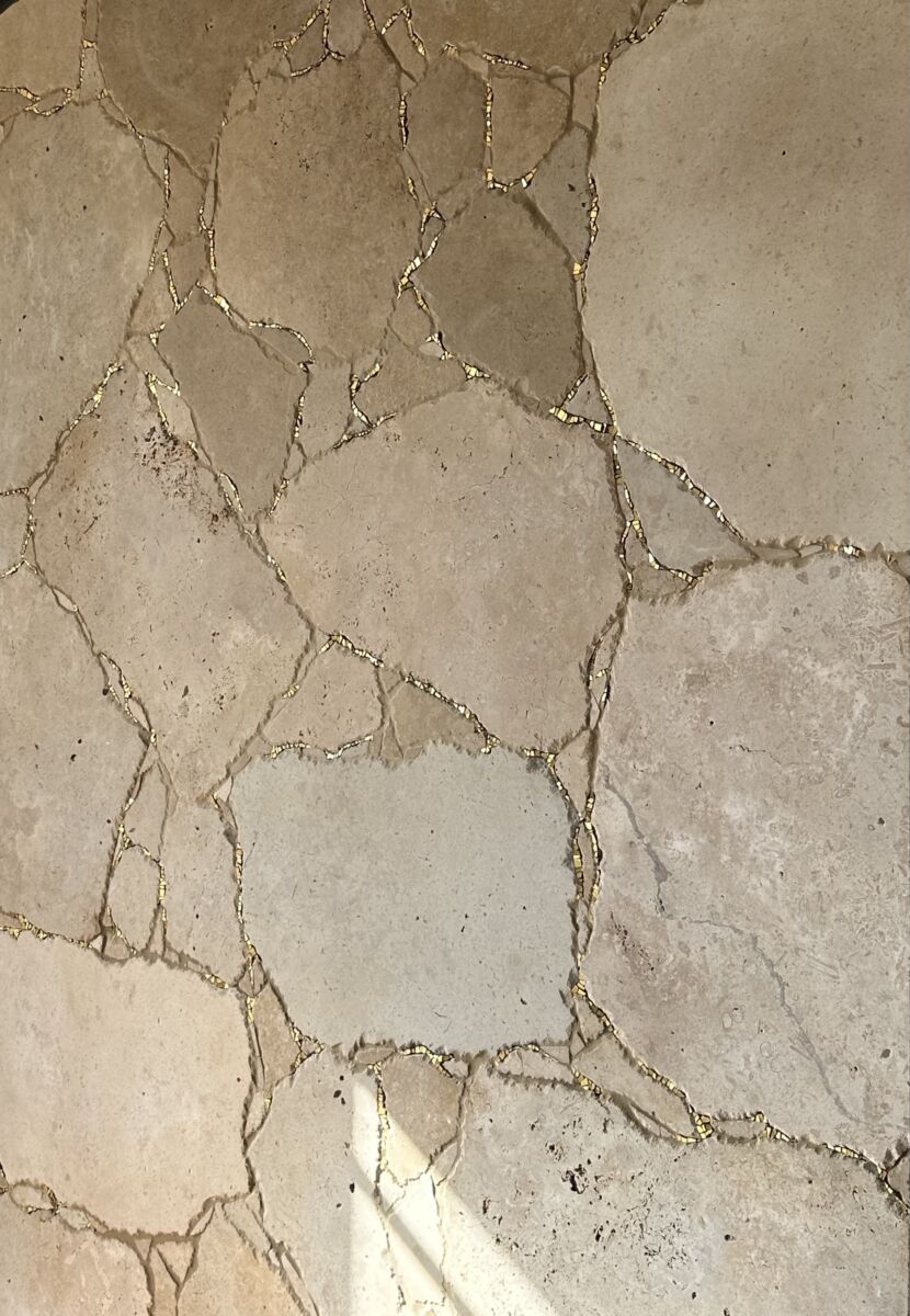 Chaque fragment de travertin a été soigneusement assemblé, puis souligné de tesselles d’or qui captent la lumière et révèlent la matière.