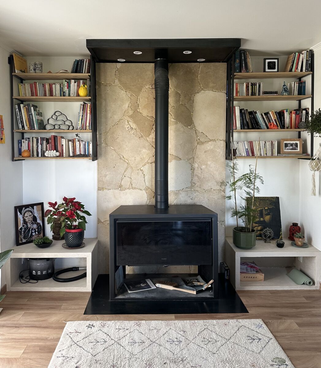 Un dialogue entre chaleur, texture et raffinement, pensé comme un écrin pour ce poêle contemporain.