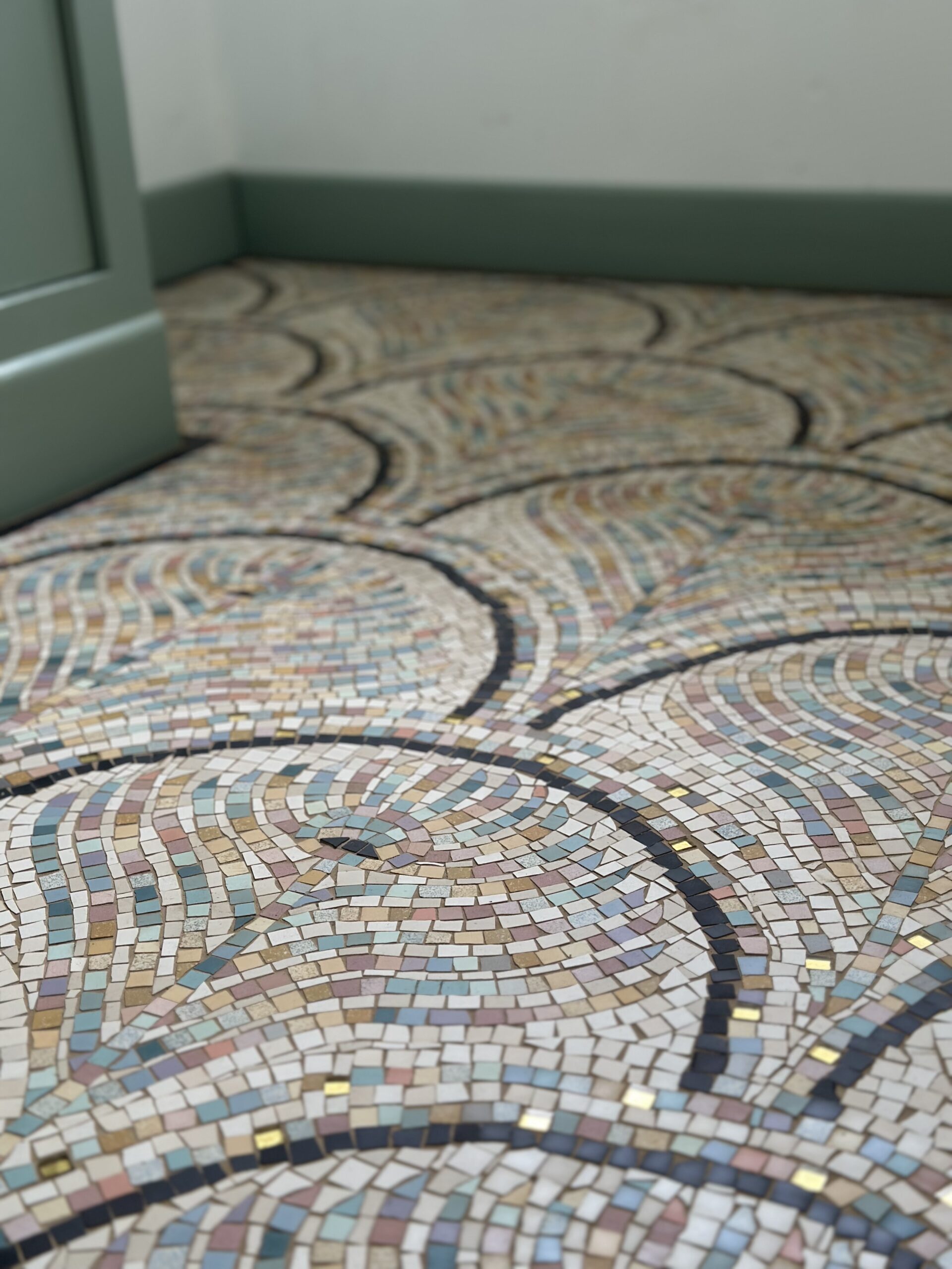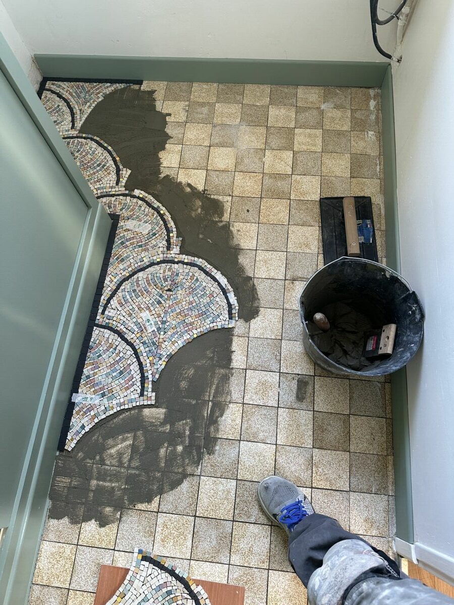 Création d’un sol en mosaïque sur mesure, réalisé en grès cérame et tesselles d’or.
